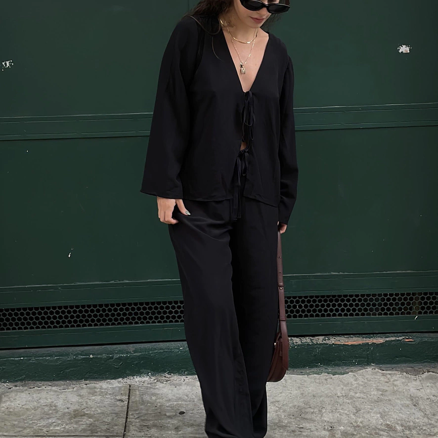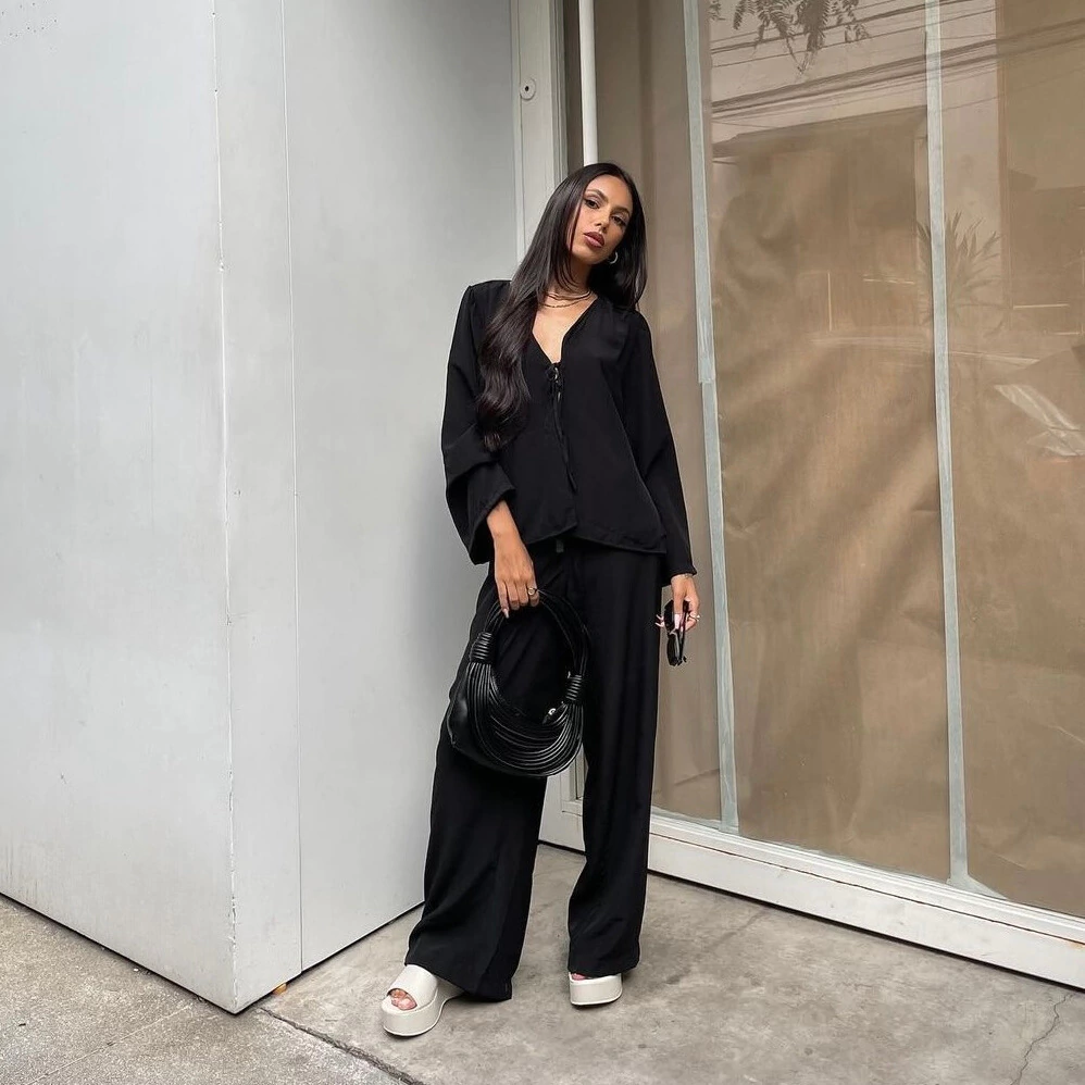 Você vai se encantar com o Top Lacy! Esta peça é a definição de elegância e conforto, confeccionada com um tecido leve que proporciona uma sensação incrível na pele. O decote V destaca sua silhueta e traz um toque de sofisticação, enquanto as mangas compridas e dramáticas conferem um charme irresistível.